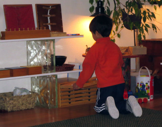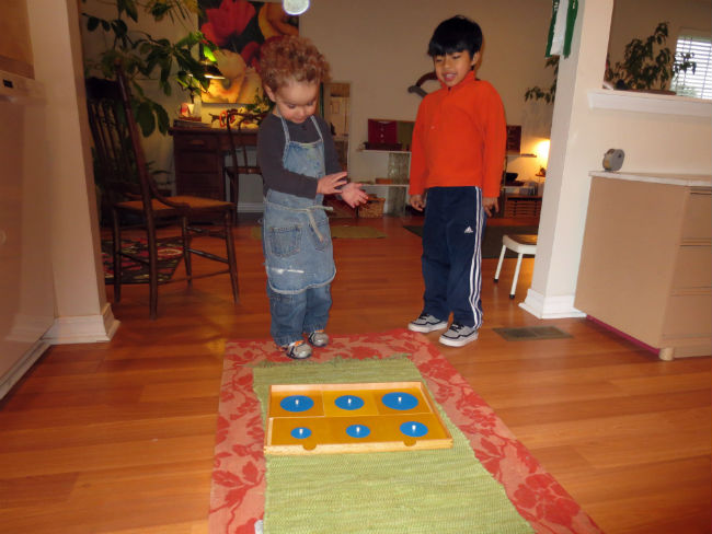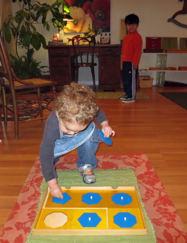 While this series of photos highlight Solin’s work with shapes, Miro may be benefiting the most from this interaction. In Montessori’s mixed-age classroom, the elder child is able to work on their leadership and social skills, while modeling the proper use also allows them to develop a deeper understanding of the material. Studies have also shown that younger children are often more receptive to instruction from a peer, especially if it’s reinforcing a lesson they’ve already received from their guide.